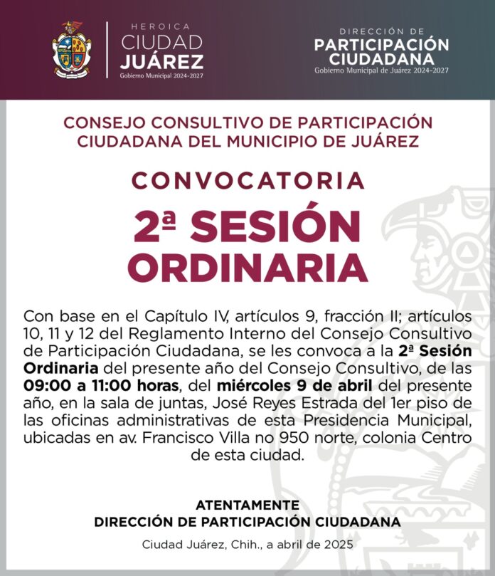 La Dirección de Participación Ciudadana invita a la ciudadanía para que acudan a la segunda sesión ordinaria del Consejo Consultivo, la cual se llevará a cabo el próximo miércoles 9 a las 9:00 de la mañana, indicó el titular de la dependencia, Sebastián Aguilera Brenes.