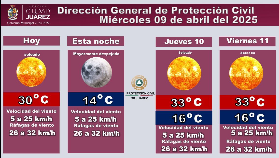 La Dirección General de Protección Civil emitió el pronóstico del clima correspondiente a este miércoles 9 de abril, informando condiciones mayormente estables y soleadas para los próximos días.