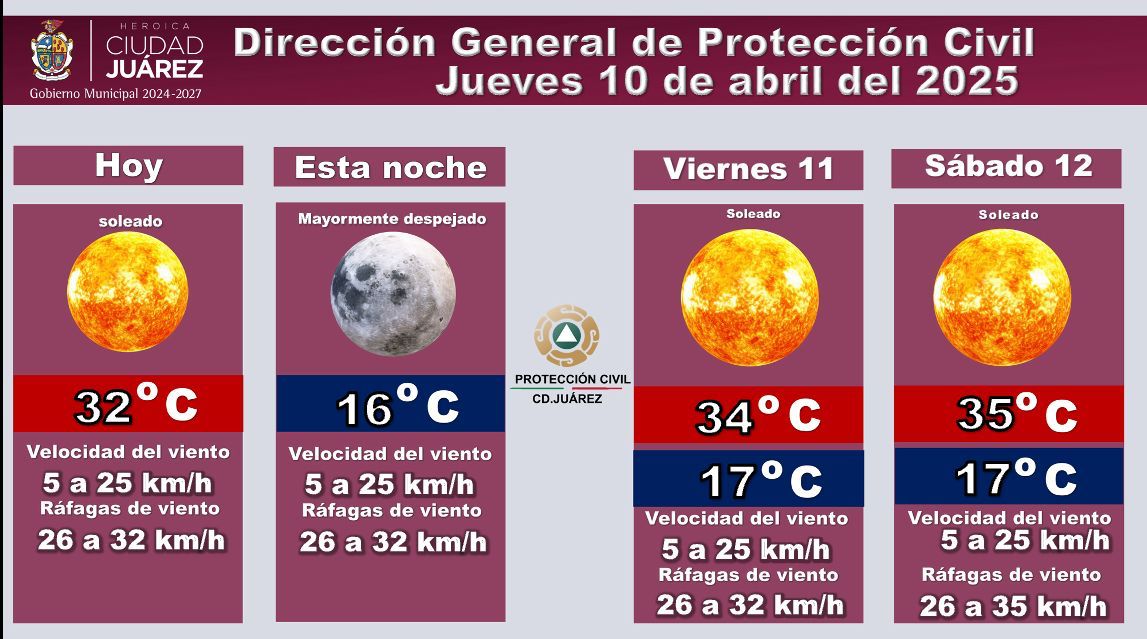 La Dirección General de Protección Civil informa sobre el pronóstico del clima para los días jueves 10, viernes 11 y sábado 12 de abril.