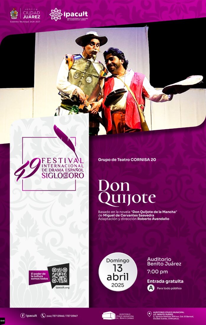 El Instituto para la Cultura del Municipio de Juárez (IPACULT) invita a toda la ciudadanía a disfrutar de la obra Don Quijote, que abrirá la edición número 49 del Festival Internacional de Drama Español del Siglo de Oro, este domingo 13 de abril a las 7:00 de la tarde en el Auditorio Cívico Municipal Benito Juárez.