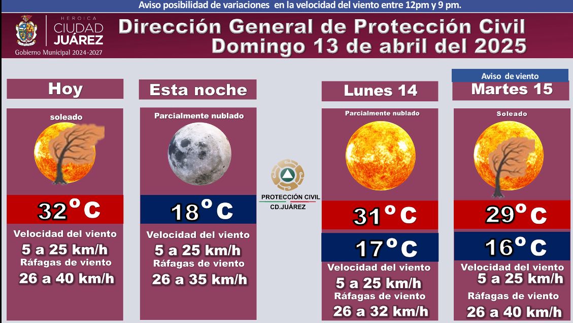 La Dirección General de Protección Civil de Ciudad Juárez emitió el pronóstico del clima correspondiente al domingo 13 de abril de 2025.