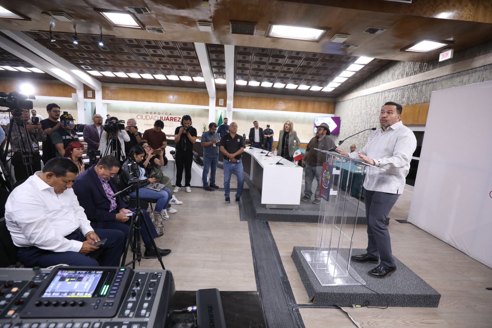 Durante la conferencia de prensa semanal en la Unidad Administrativa “Lic. Benito Juárez”, el Presidente Municipal destacó la idea de la mandataria federal de no prohibir los narcocorridos durante los conciertos, pero sí promover música con otros contenidos a través de iniciativas como el concurso México Canta, que busca fomentar la música sin violencia.