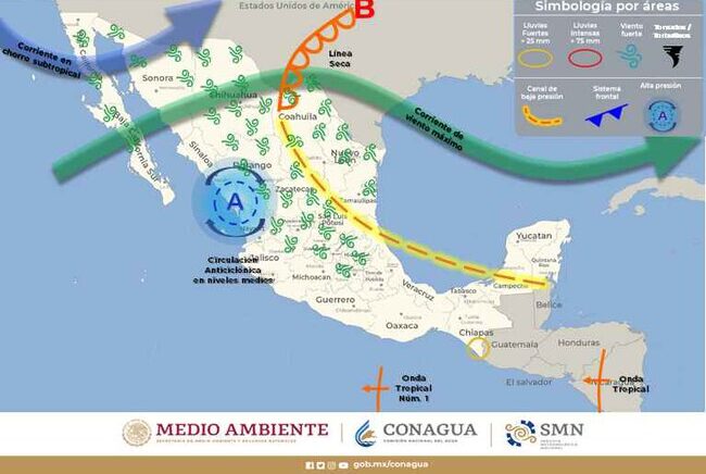 Una circulación anticiclónica en niveles medios de la atmósfera y el bajo contenido de vapor de agua, mantendrán escaso potencial de lluvia y ambiente vespertino caluroso a muy caluroso en gran parte de la República Mexicana, con temperaturas máximas de 40 a 45 °C en zonas de Chihuahua (suroeste), Durango (noroeste), Sinaloa y Guerrero.