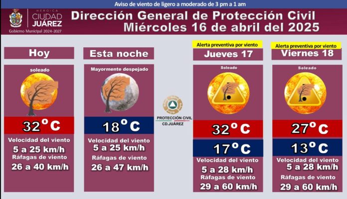 Los vientos oscilarán entre los 5 a 25 kilómetros por hora, con ráfagas que alcanzarán los 40 kilómetros por hora, se prevé lo picos más altos entre 5:00 y 7:00 de la tarde, después continuarán variaciones de viento.