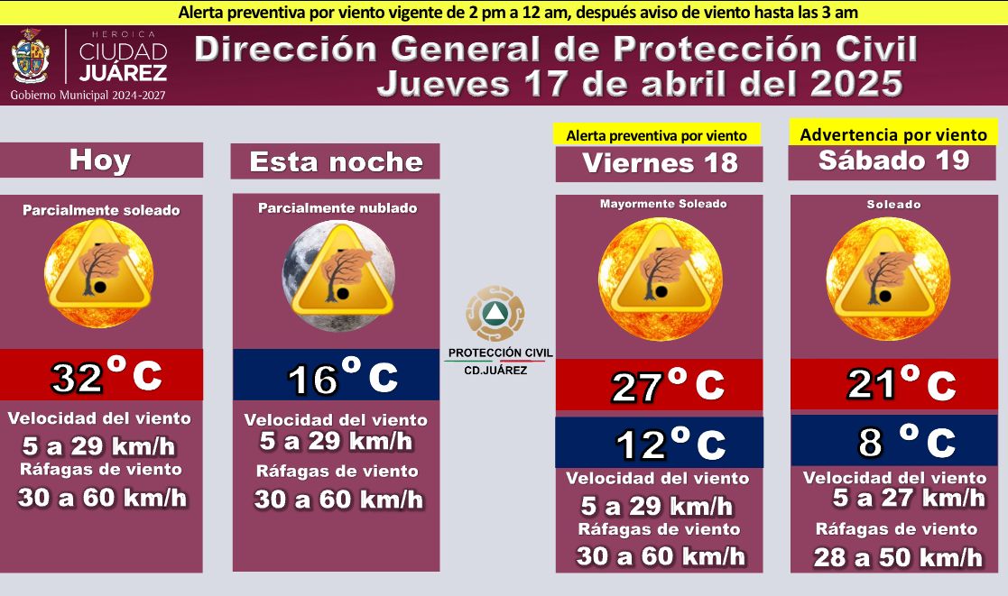 La Dirección General de Protección Civil del Municipio, informa que para hoy se contempla viento en la región, por lo que la recomendación a los juarenses es extremar precauciones.