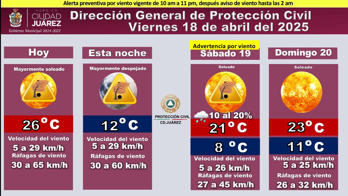 La Dirección General de Protección Civil dio a conocer que este día se podrían presentar ráfagas de viento que alcancen su pico más alto entre las 13:00 y 20:00 horas, además de tolvaneras, polvo y reducción de visibilidad en algunas áreas de la ciudad, por lo que pide a la comunidad que extreme precauciones.