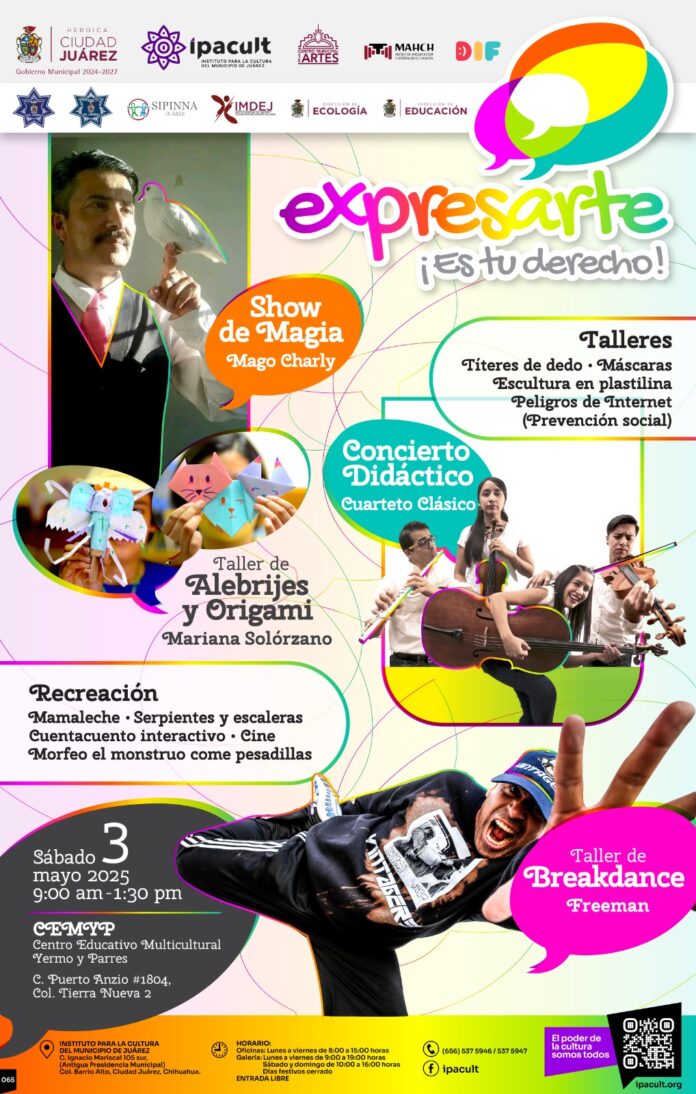 En una iniciativa que busca fortalecer la cultura, el arte y los derechos de la infancia, el Instituto para la Cultura del Municipio de Juárez (IPACULT) llevará el programa “Expresarte: ¡Es tu derecho!” al Centro Educativo Multicultural Yermo y Parres (CEMYP) este sábado 3 de mayo a partir de las de 9:00 de la mañana.