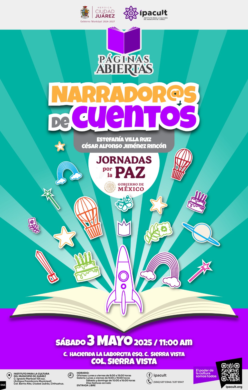 Dentro de esta jornada de atención integral, IPACULT presentará a las 11:00 de la mañana una sesión especial de “Narradores de Cuentos”, a cargo de Estefanía Villa Ruiz y César Alfonso Jiménez Rincón.