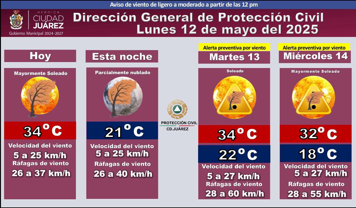 Para mañana martes 13 y el miércoles 14 se ha emitido una alerta preventiva por viento. El martes se pronostica un día soleado con temperaturas de entre 22 °C y 34 °C y ráfagas de viento de 28 a 60 kilómetros por hora.
