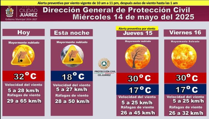 La Dirección General de Protección Civil emitió una alerta preventiva por viento para este miércoles 14 de mayo, con vigencia de 10:00 de la mañana a 11:00 de la noche, extendiéndose posteriormente como aviso de viento hasta la 1:00 de la madrugada.