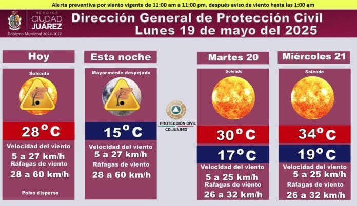 La Dirección General de Protección Civil emitió el pronóstico del clima para este lunes 19 de mayo, junto con una alerta preventiva por viento vigente de las 11:00 de la mañana a las 11:00 de la noche, y un aviso posterior que se extiende hasta la 1:00 de la madrugada.