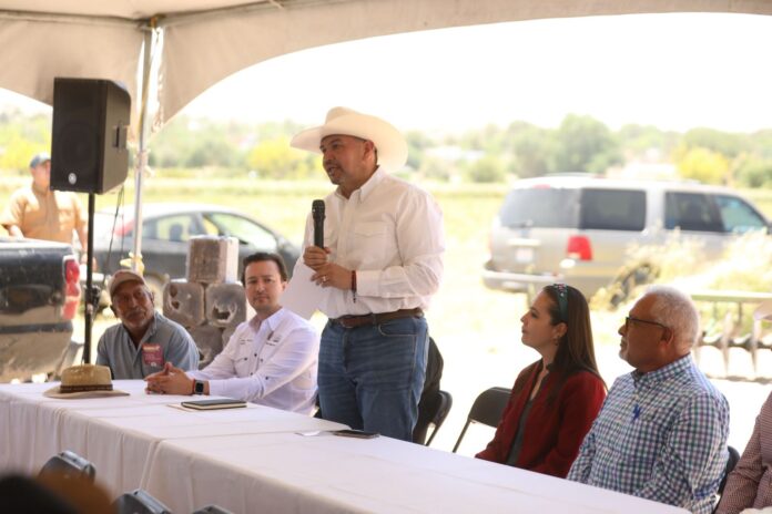 En un evento realizado en el ejido San Isidro, el Presidente Municipal, Cruz Pérez Cuéllar, presidió este día la entrega simbólica de solución nutritiva a productores del Valle de Juárez.