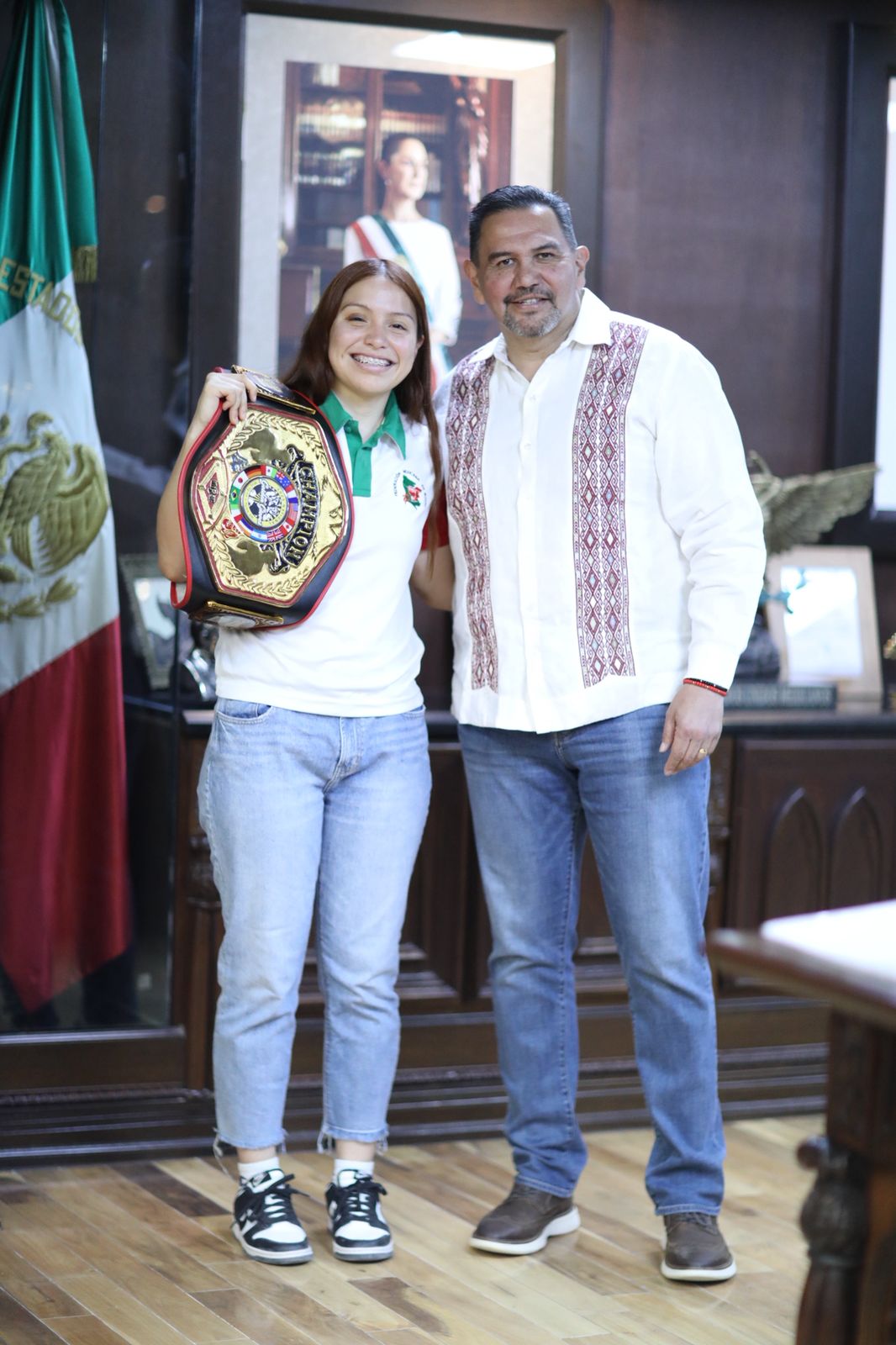 La boxeadora juarense Suzeth Ramírez Hernández visitó este día al Presidente Municipal, Cruz Pérez Cuéllar para agradecerle el respaldo brindado a lo largo de su carrera y compartirle personalmente el campeonato que recientemente obtuvo en una competencia internacional.