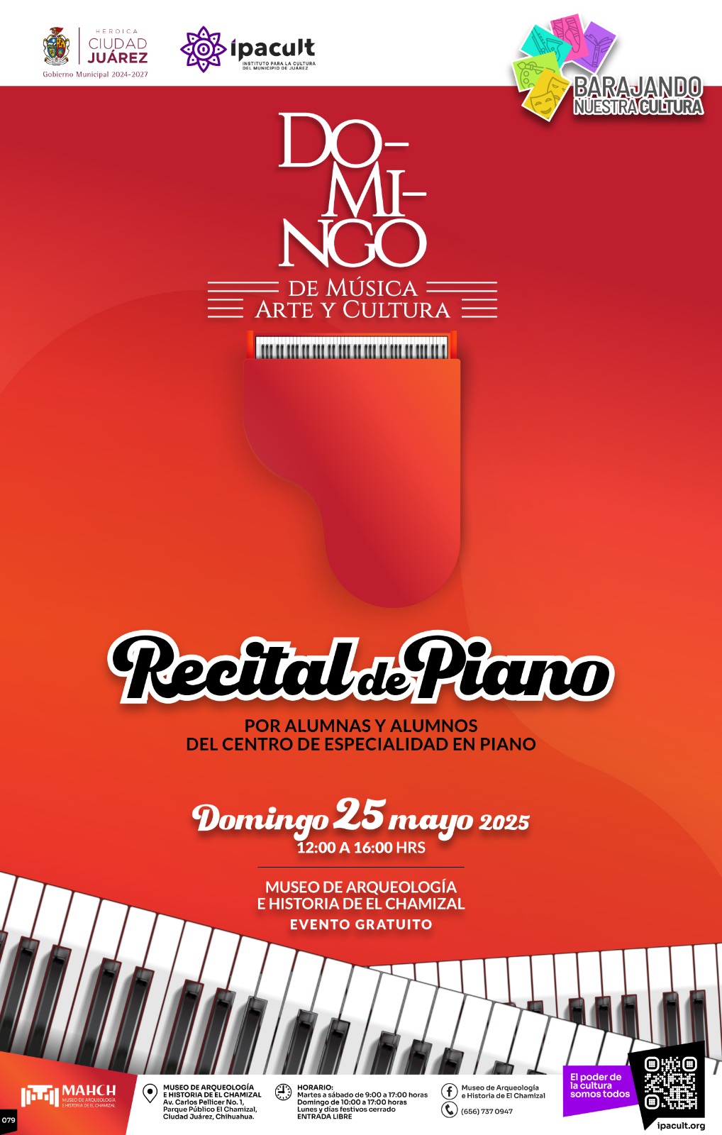 En el marco de la celebración del Día Internacional de los Museos, el Instituto para la Cultura del Municipio de Juárez (IPACULT) hace una invitación a toda la comunidad para que asistan al recital “Do-Mi-ngo de música, arte y cultura”, que se llevará a cabo este domingo 25 de mayo a las 12:00 del mediodía en el Museo de Arqueología e Historia de El Chamizal (MAHCH).