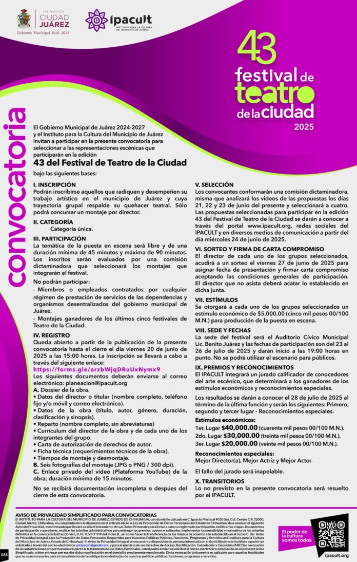 El Instituto para la Cultura del Municipio de Juárez (IPACULT) anunció en conferencia de prensa la apertura oficial de la convocatoria para participar en la edición 43 del Festival de Teatro de la Ciudad, evento que se llevará a cabo del 23 al 26 de julio en el Auditorio Cívico Municipal Benito Juárez.