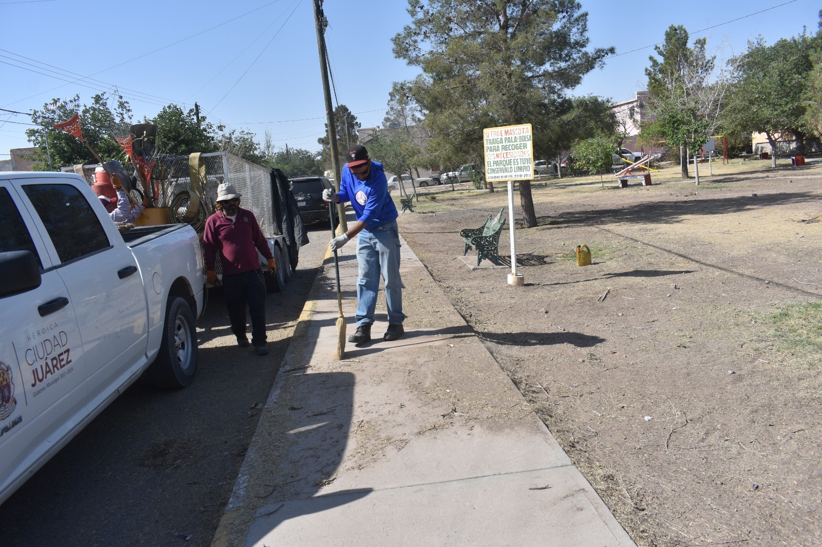 La Dirección de Parques y Jardines del Gobierno Municipal realiza labores de mantenimiento y reforestación en el parque de la Unidad Habitacional Benito Juárez, ubicada sobre la calle Camino Viejo a San José, como parte de las acciones derivadas del retiro de árboles en el camellón de la avenida Ejército Nacional.