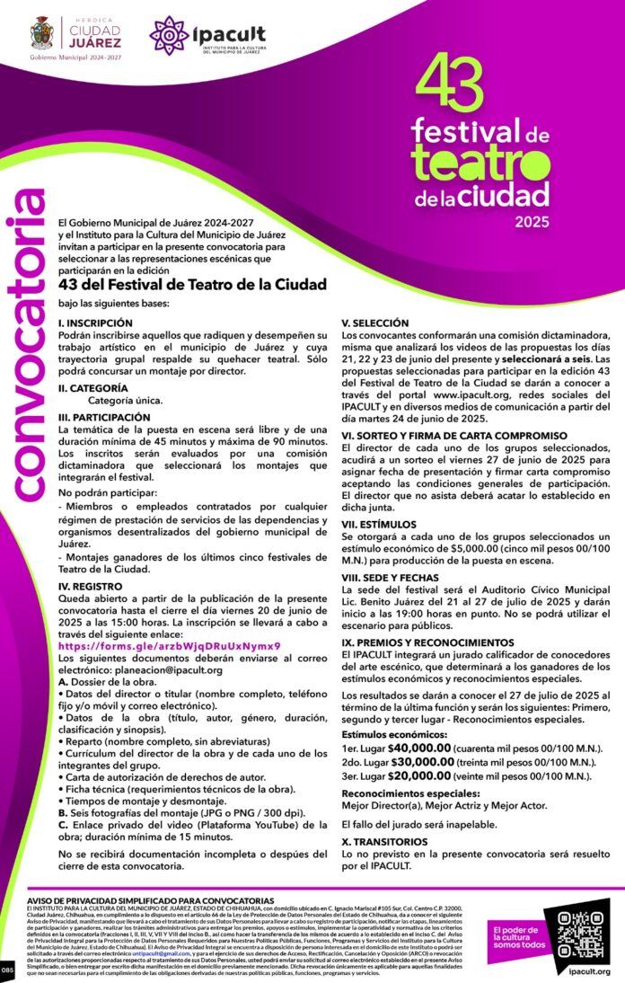Tras la notable respuesta de la comunidad teatral y en atención a diversas inquietudes expresadas por participantes, el Instituto para la Cultura del Municipio de Juárez (IPACULT) anuncia una serie de modificaciones en la convocatoria de la edición 43 del Festival de Teatro de la Ciudad.