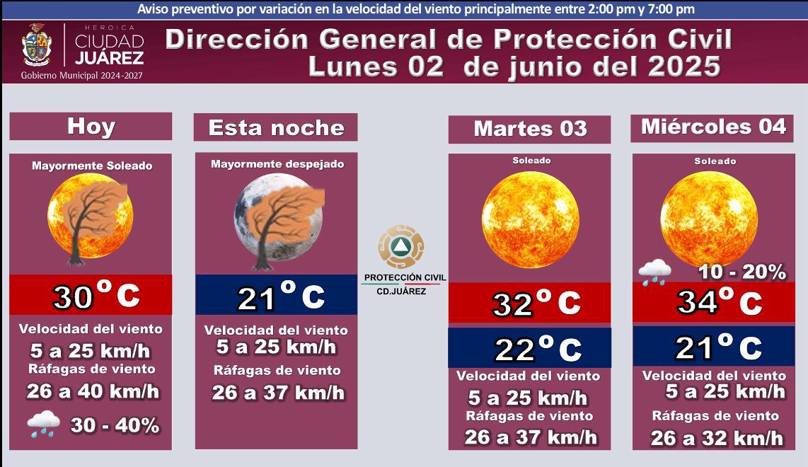 Protección Civil recomienda a la ciudadanía tomar precauciones ante las variaciones en la velocidad del viento, especialmente entre las 2:00 y las 7:00 de la tarde.