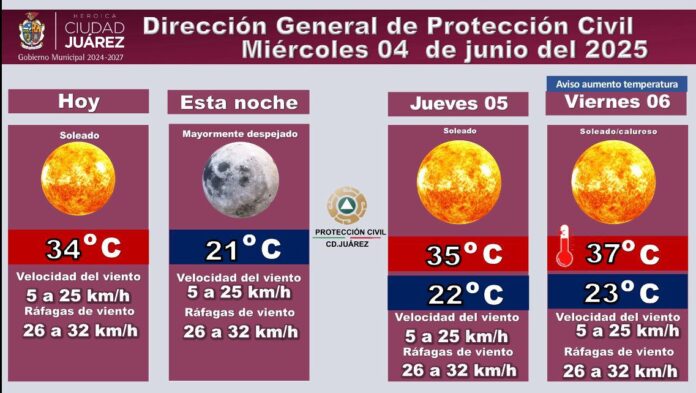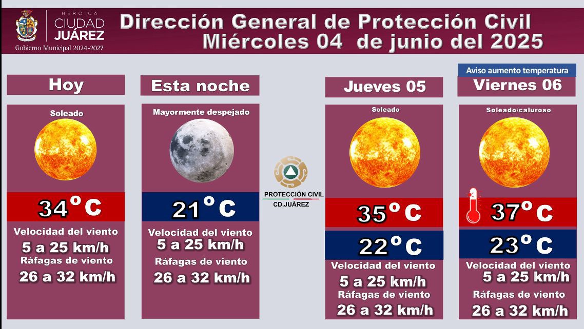 La Dirección General de Protección Civil informó el pronóstico del clima para los días miércoles 4, jueves 5 y viernes 6 de junio, destacando un incremento en las temperaturas hacia el fin de semana.