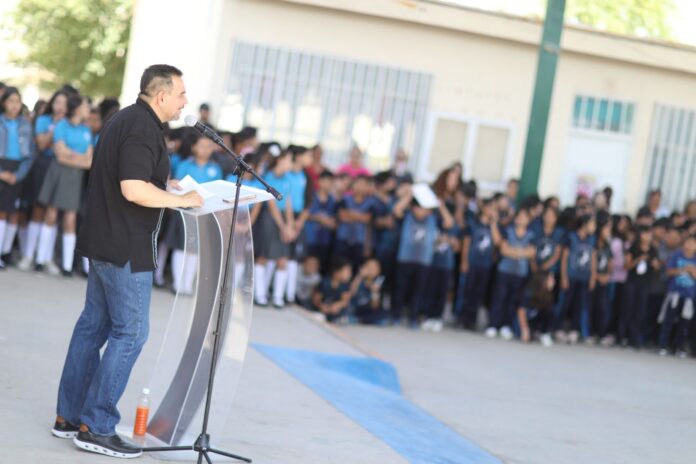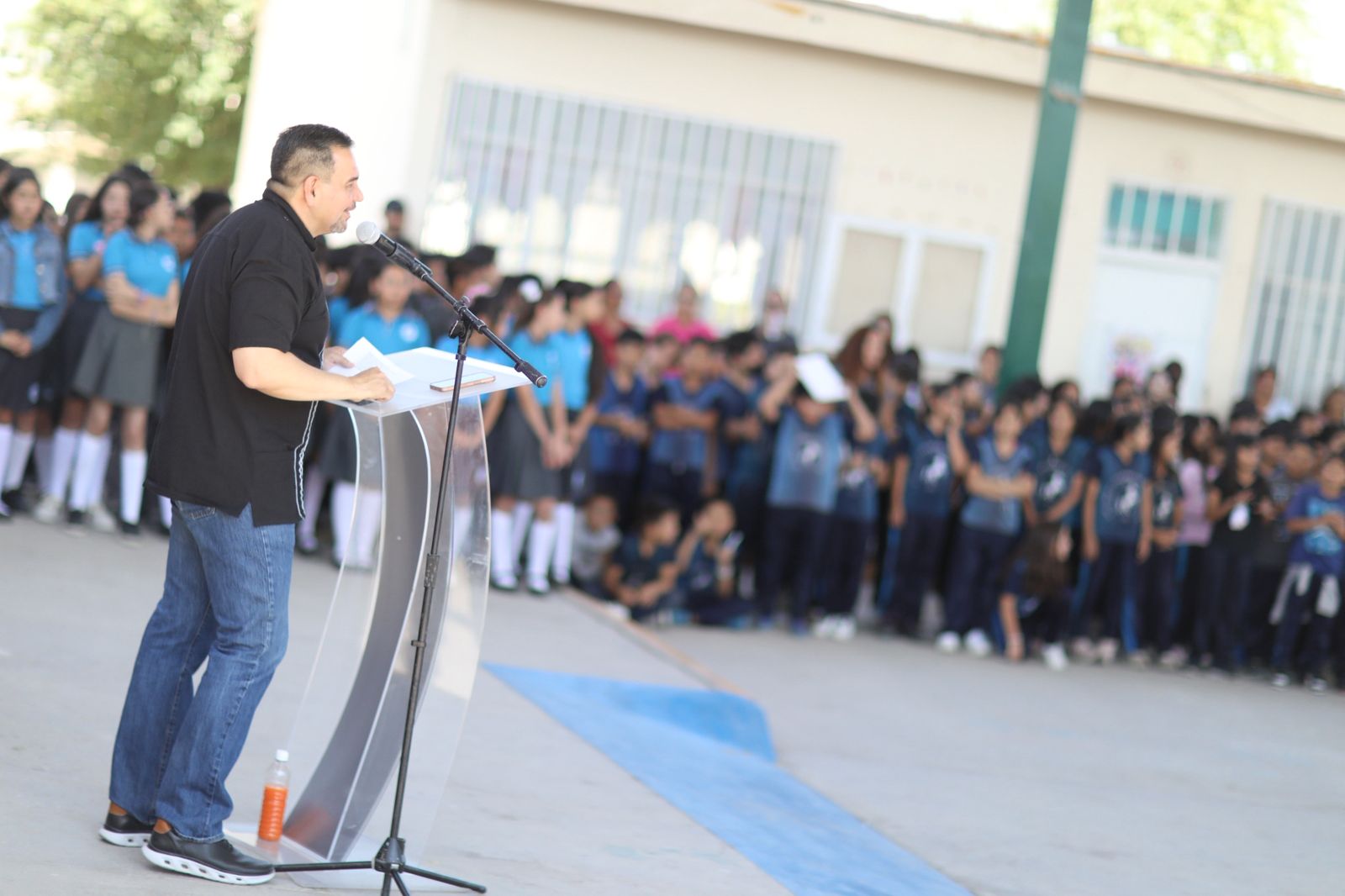 El Presidente Municipal, Cruz Pérez Cuéllar, entregó este día las mejoras que se hicieron en la Escuela Fernando Ahuatzin Reyes, ubicada en la Carretera Casas Grandes.