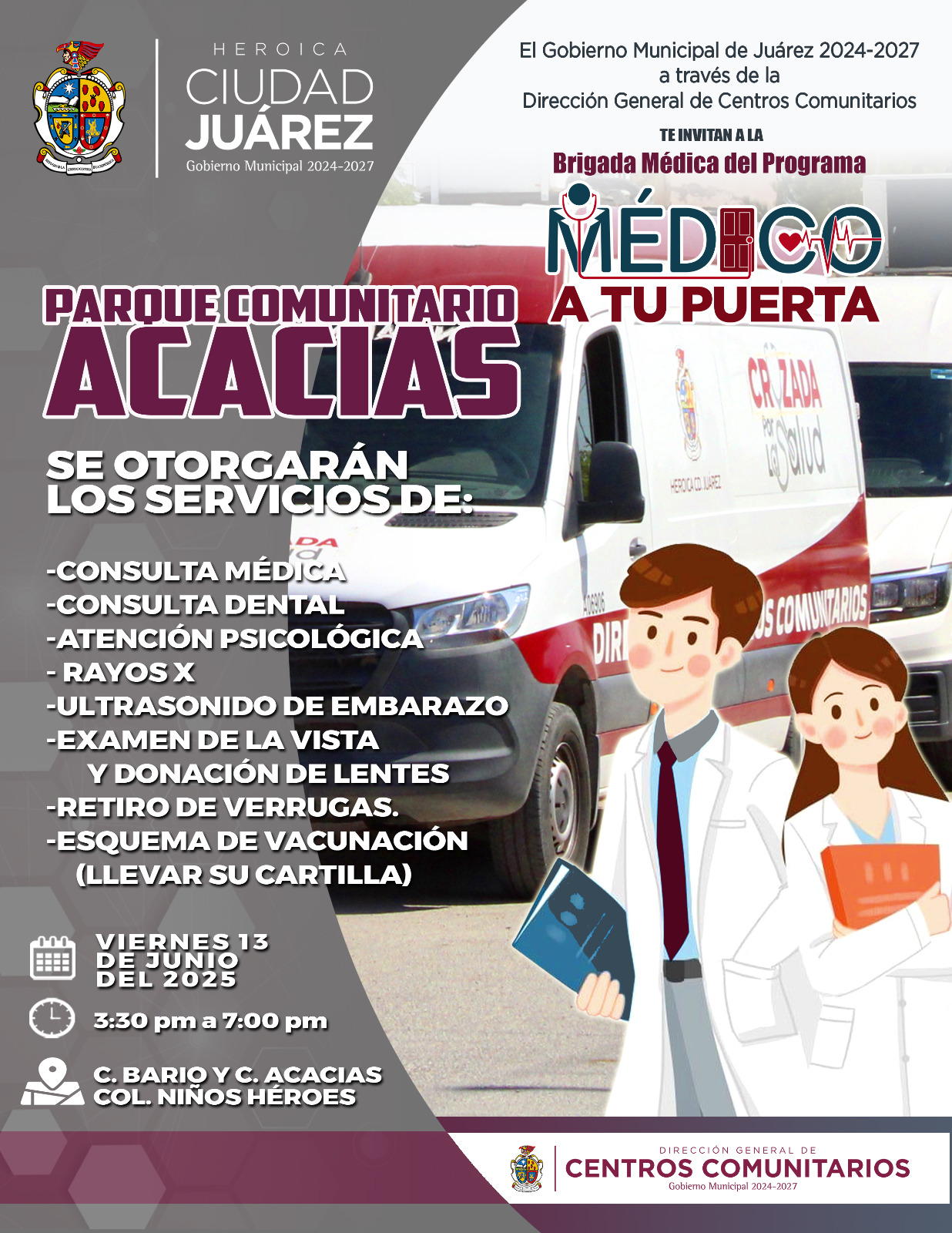 El Gobierno Municipal, a través de la Dirección General de Centros Comunitarios, llevará a cabo hoy una brigada del programa Médico a tu Puerta al Parque Comunitario Acacias, ubicado en la calle Bario y Acacias, en la colonia Niños Héroes.