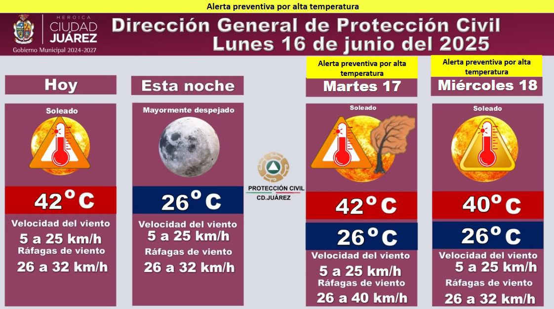 La Dirección General de Protección Civil emitió una alerta preventiva por alta temperatura para los días lunes 16, martes 17 y miércoles 18 de junio, debido a las condiciones extremas de calor que se presentarán en la región.