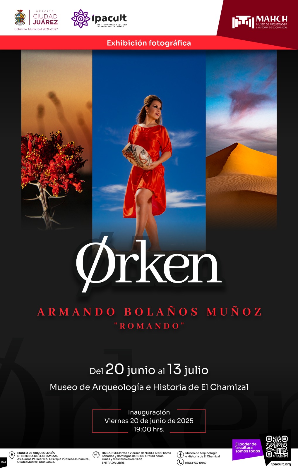 El Instituto para la Cultura del Municipio de Juárez (IPACULT) invita a la comunidad fronteriza a la inauguración de la exposición fotográfica “Ørken” del artista visual Armando Bolaños Muñoz, conocido como “Romando”, que se llevará a cabo este viernes 20 de junio a las 7:00 de la tarde en el Museo de Arqueología e Historia de El Chamizal (MAHCH).