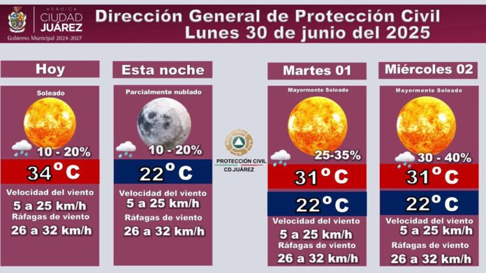 El miércoles 2 de julio continuará mayormente soleado, con temperaturas similares al martes, máxima de 31 y mínima de 22 grados centígrados. La probabilidad de lluvia será de entre 30 y 40 por ciento, manteniéndose la misma velocidad del viento y las ráfagas.