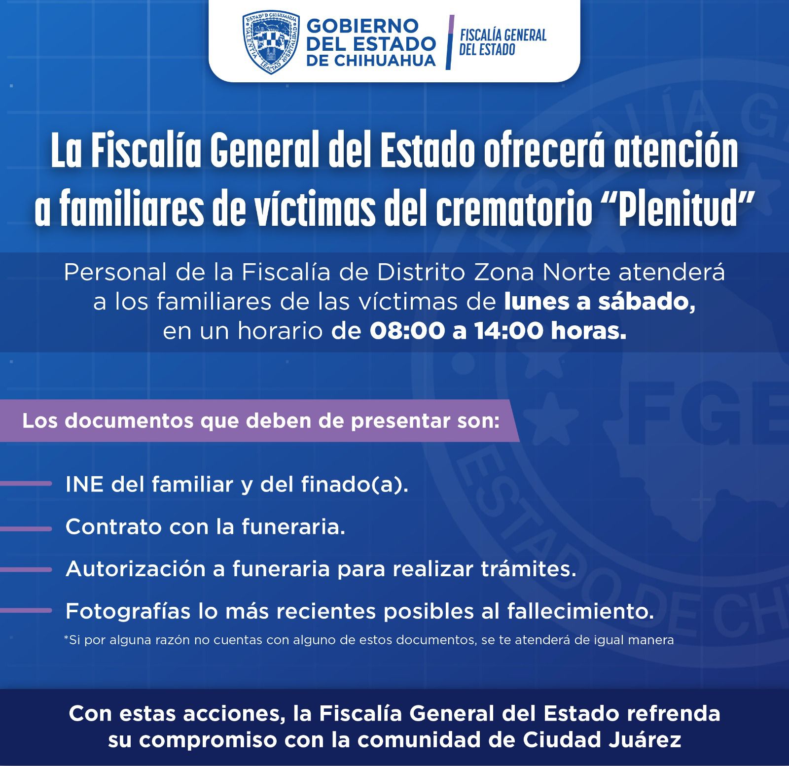 Personal de la Fiscalía General del Estado en la Zona Norte, brindará atención a familiares víctimas del crematorio “Plenitud”, de lunes a sábado, en un horario de 08:00 a 14:00 horas.