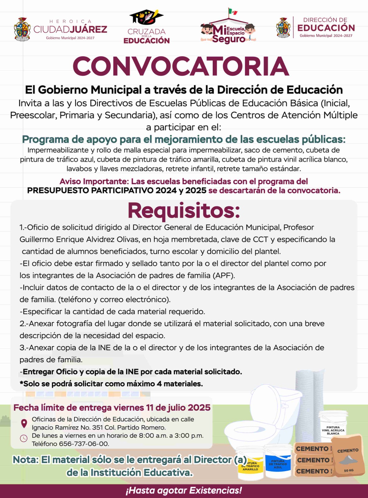 El Gobierno Municipal a través de la Dirección de Educación convoca a directores de escuelas públicas de educación básica y Centros de Atención Múltiple, a participar en la entrega material como impermeabilizante y malla, pinturas, lavabos, retretes y cemento.