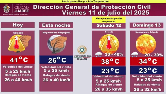 La Dirección General de Protección Civil de Ciudad Juárez emitió una alerta preventiva por altas temperaturas para este fin de semana, destacando condiciones extremas desde este viernes 11 de julio de 2025.