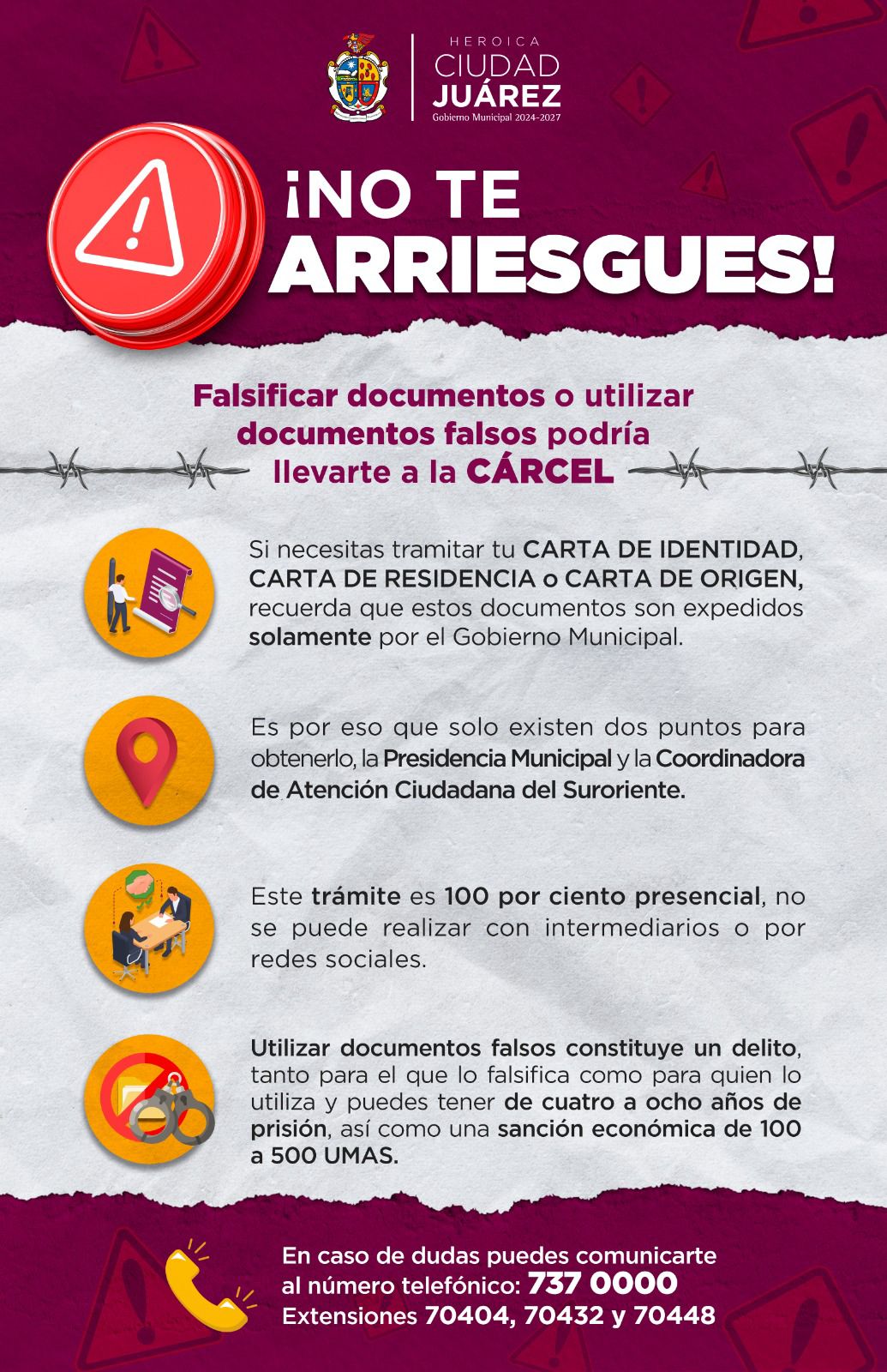 Detalló que para la carta de residencia se requiere tener credencial de elector vigente y con domicilio en Juárez de más de seis meses o acreditar que su estadía de más de seis meses radicando en la ciudad.