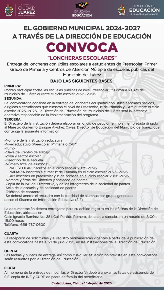 Miércoles 16 de julio de 2025.- El Gobierno Municipal, a través de la Dirección de Educación, lanza la convocatoria a directores de instituciones públicas de preescolar, primaria y Centros de Atención Múltiple (CAM) para participar en el programa de entrega de loncheras escolares.