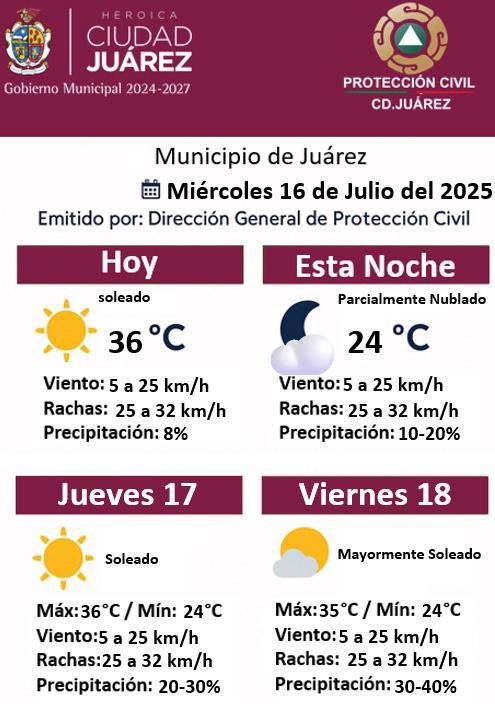 La Dirección General de Protección Civil del Municipio informa el pronóstico del clima para este miércoles 16 de julio y los días siguientes.