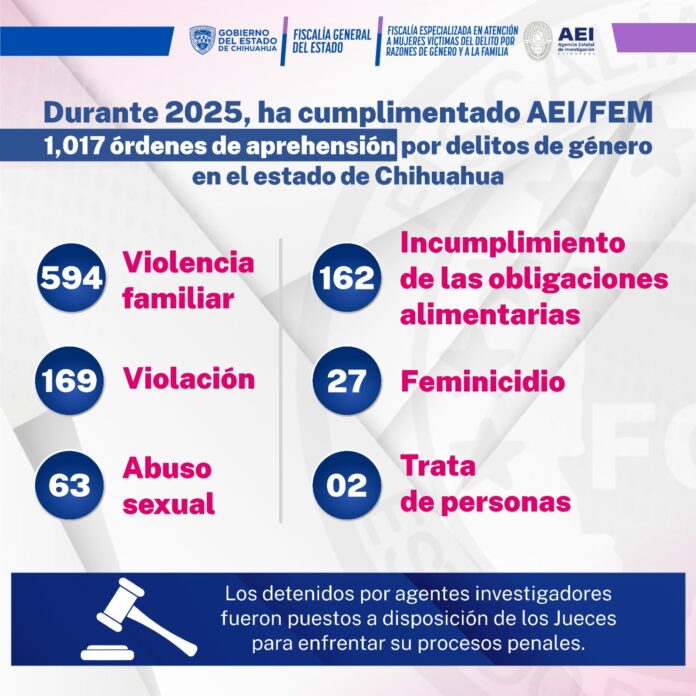 El puntual seguimiento de las investigaciones a cargo de la Fiscalía Especializada en Atención a Mujeres Víctimas del Delito por Razones de Género y a la Familia, permitió que, de enero a junio de 2025, elementos de la Agencia Estatal de Investigación cumplimentaran 1,017 órdenes de aprehensión por delitos de género cometidos a niñas, adolescentes y adultas en Chihuahua.