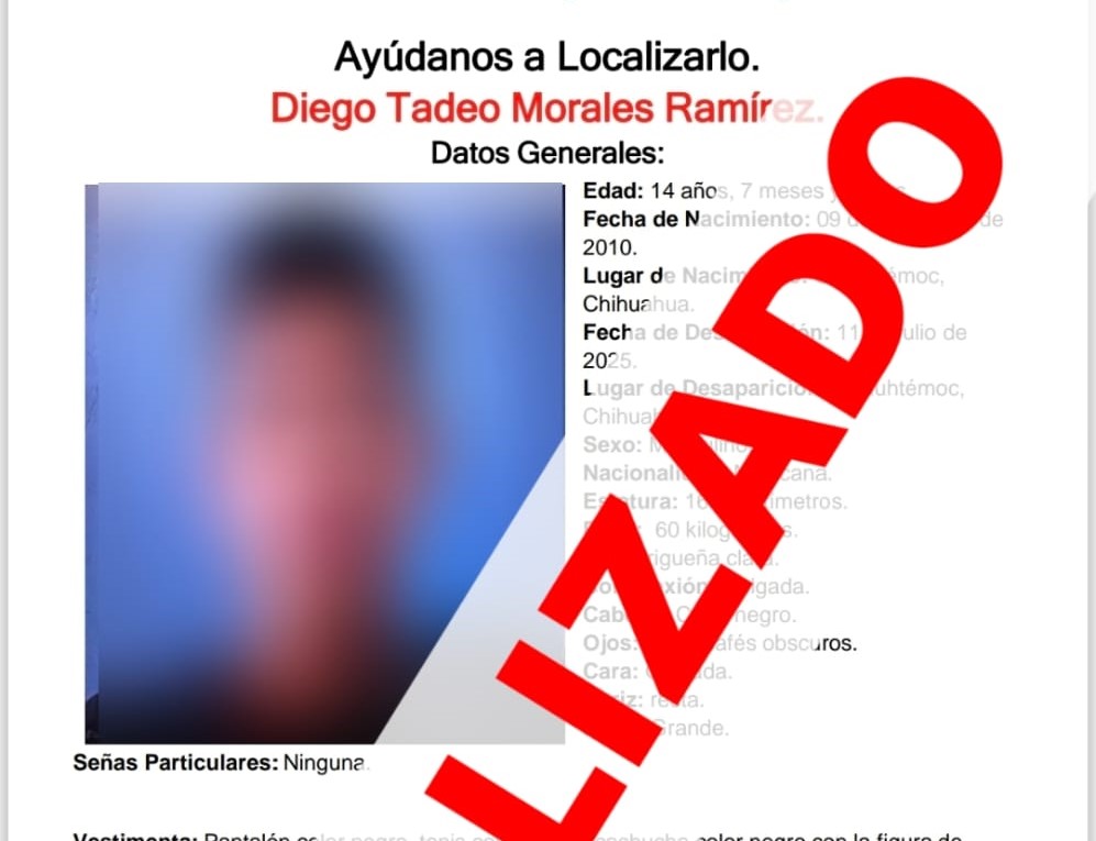 En igual forma a dos menores de edad, uno de ellos identificado con las iniciales D. T. M. R., de 14 años, quien fue reportado como desaparecido el 11 de julio del 2025 en el municipio de Cuauhtémoc.