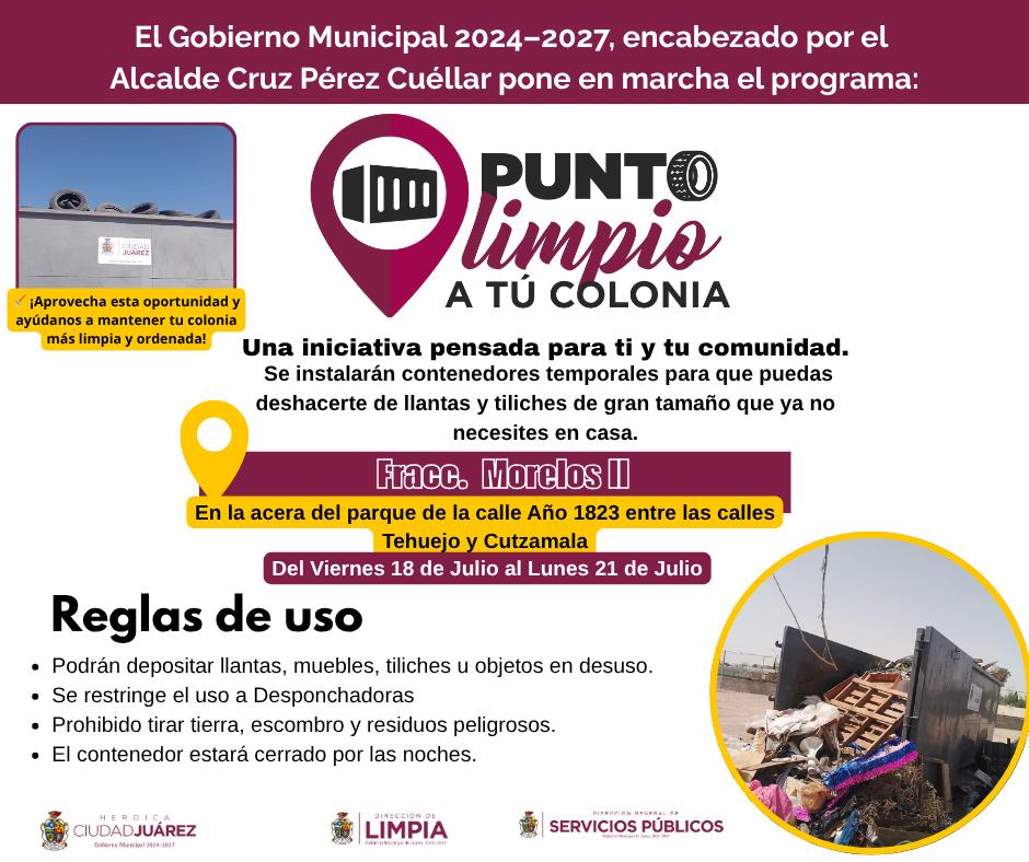 La Dirección de Limpia habilita desde ayer y hasta el lunes 21 de julio cinco nuevos Puntos Limpios en distintos sectores de la ciudad, con el propósito de facilitar a los juarenses la disposición adecuada de residuos voluminosos o de difícil manejo, como muebles, colchones, ramas y llantas.