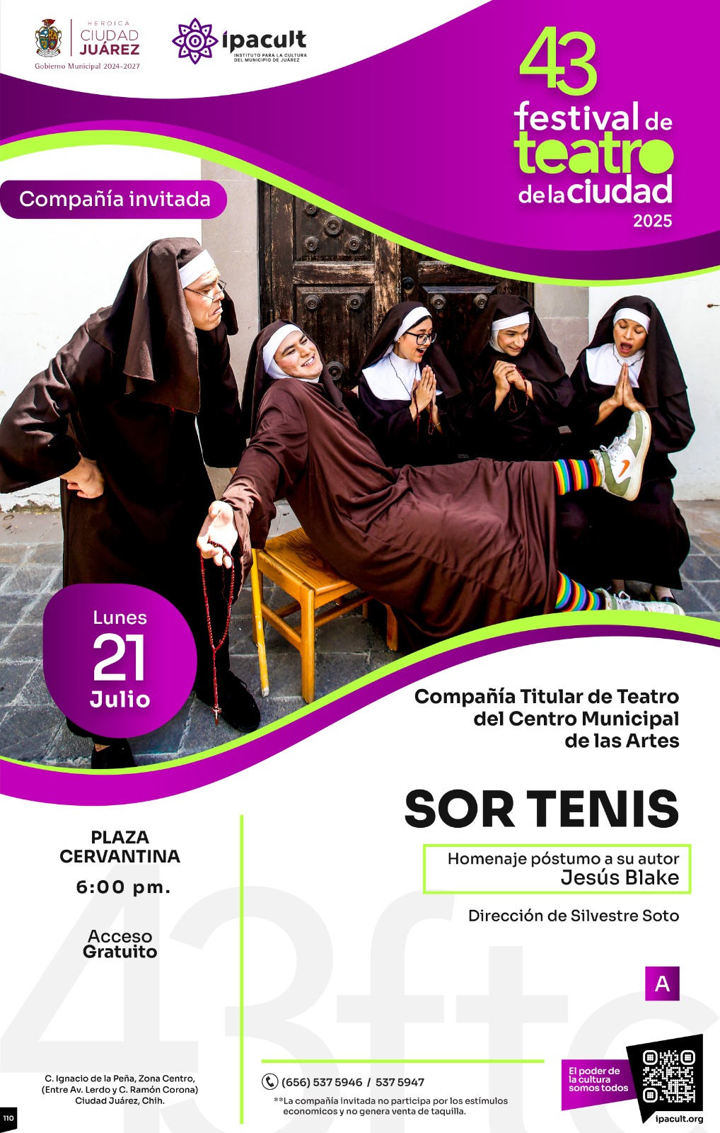 Con una puesta en escena al aire libre y mucho humor, todo está listo para que arranque la edición número 43 del Festival de Teatro de la Ciudad, que este lunes abrirá con la obra “Sor Tenis” en la Plaza Cervantina, presentada por la Compañía Titular de Teatro del Centro Municipal de las Artes (CMA).