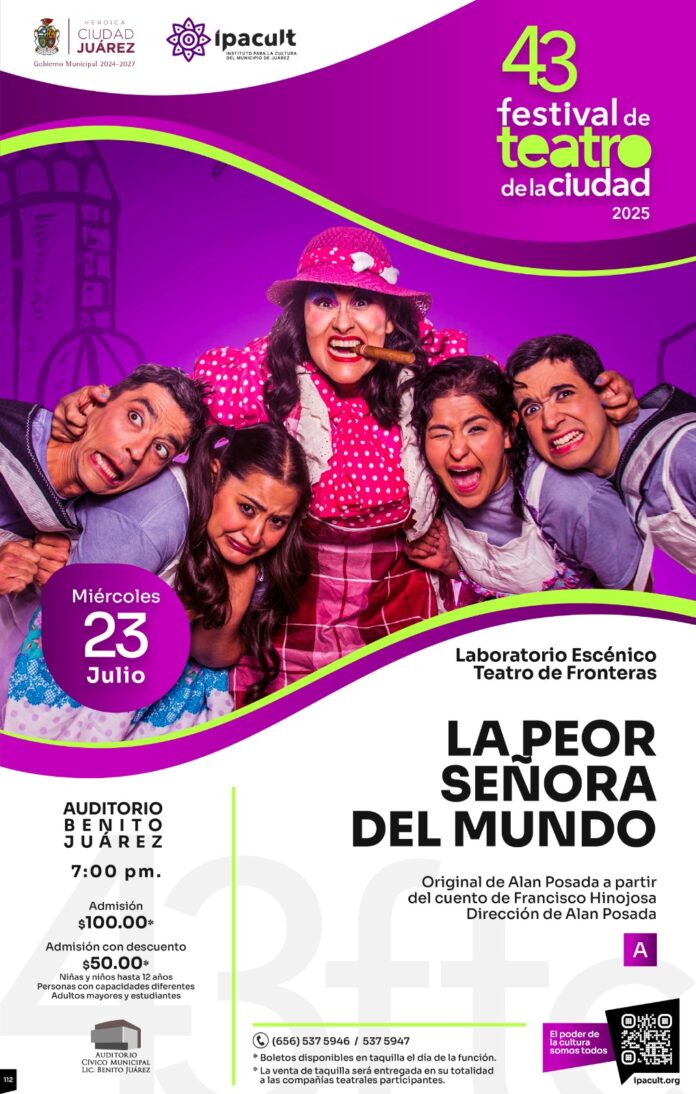La edición 43 del Festival de Teatro de la Ciudad continúa su programación con la presentación de “La peor señora del mundo”, una divertida obra basada en el clásico cuento de Francisco Hinojosa, que se presentará este miércoles en el Auditorio Cívico Benito Juárez a las 7:00 de la tarde.