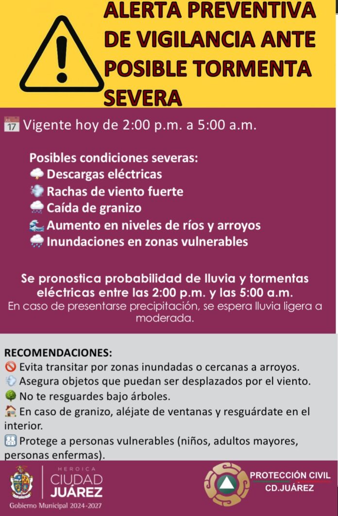 HomeREGIONALESJuárezMantienen probabilidad de lluvia y tormentas eléctricas en Juárez hasta la madrugada...