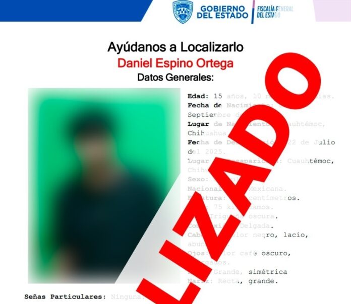 La Fiscalía de Distrito Zona Occidente, localizó salvo y salvo a un menor de 15 años, de iniciales D. E. O., quien el 22 de julio se salió junto con otros dos adolescentes del Centro de Cuidados “Madre Teresa de Calcuta” en la colonia Tierra Nueva de la ciudad de Cuauhtémoc.