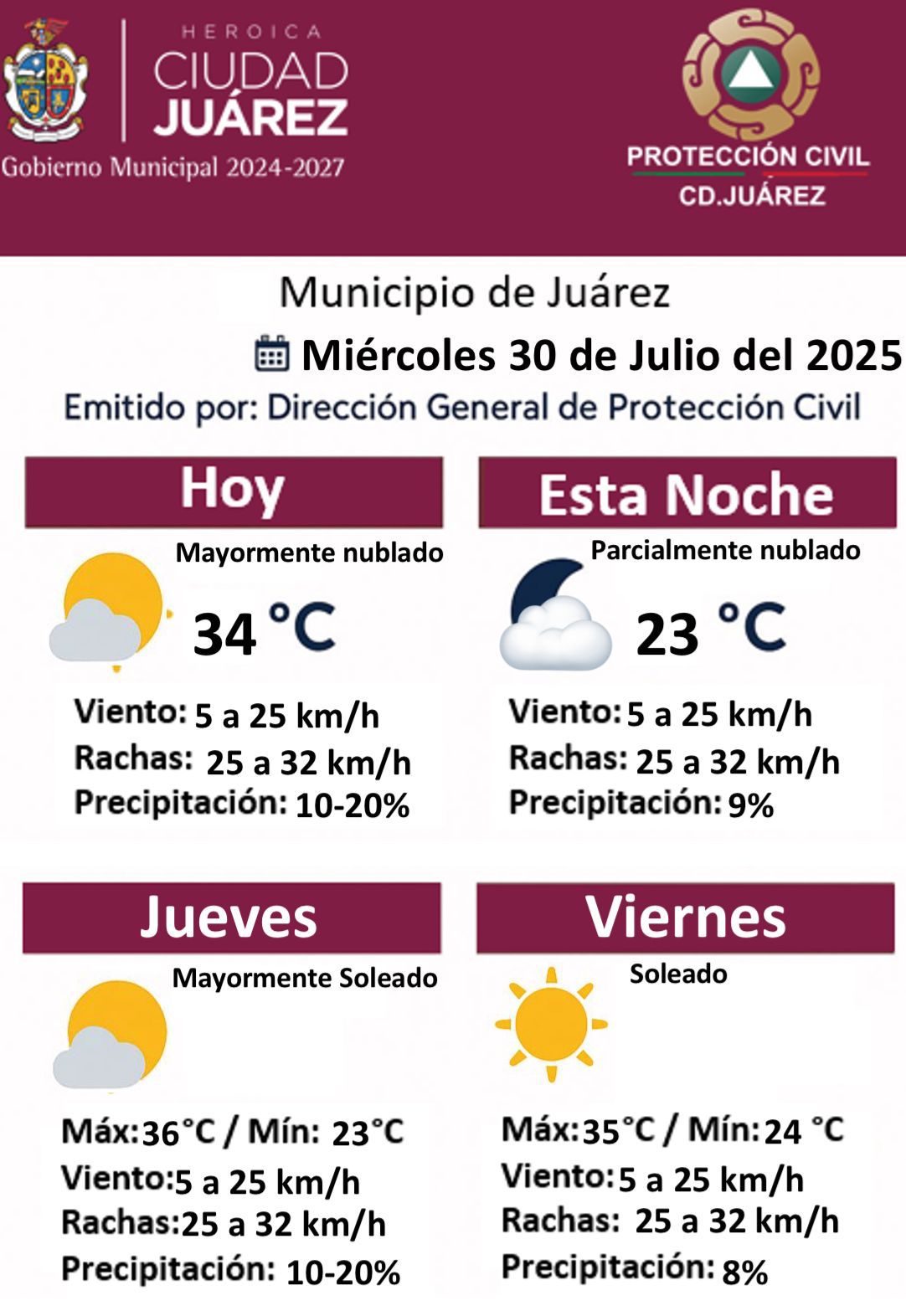 La Dirección General de Protección Civil del Municipio emitió el pronóstico del clima para este miércoles 30 de julio.