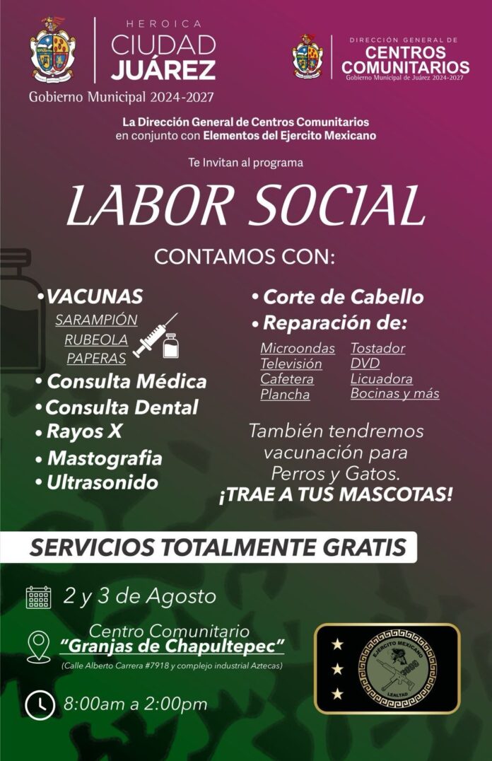 La Dirección de Centros Comunitarios, en coordinación con elementos del Ejército Mexicano, llevarán a cabo el programa Labor Social en donde se otorgarán varios servicios.