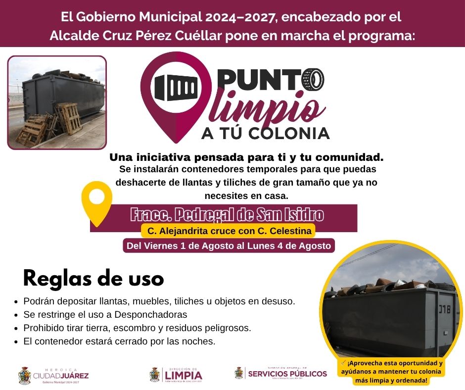 Los Puntos Limpios están desde ayer y hasta el lunes 4 de agosto en los siguientes sitios: colonia Nuevo Hipódromo, en la calle Camargo número 6507; fraccionamiento Parajes de San Isidro, en la intersección de las calles Volcán Arenal y Nevado de Toluca; calle Calzada del Río, frente a la Privada Paloma número #9765 y en el fraccionamiento Pedregal de San Isidro, en el cruce de las calles Alejandrita y Celestina.