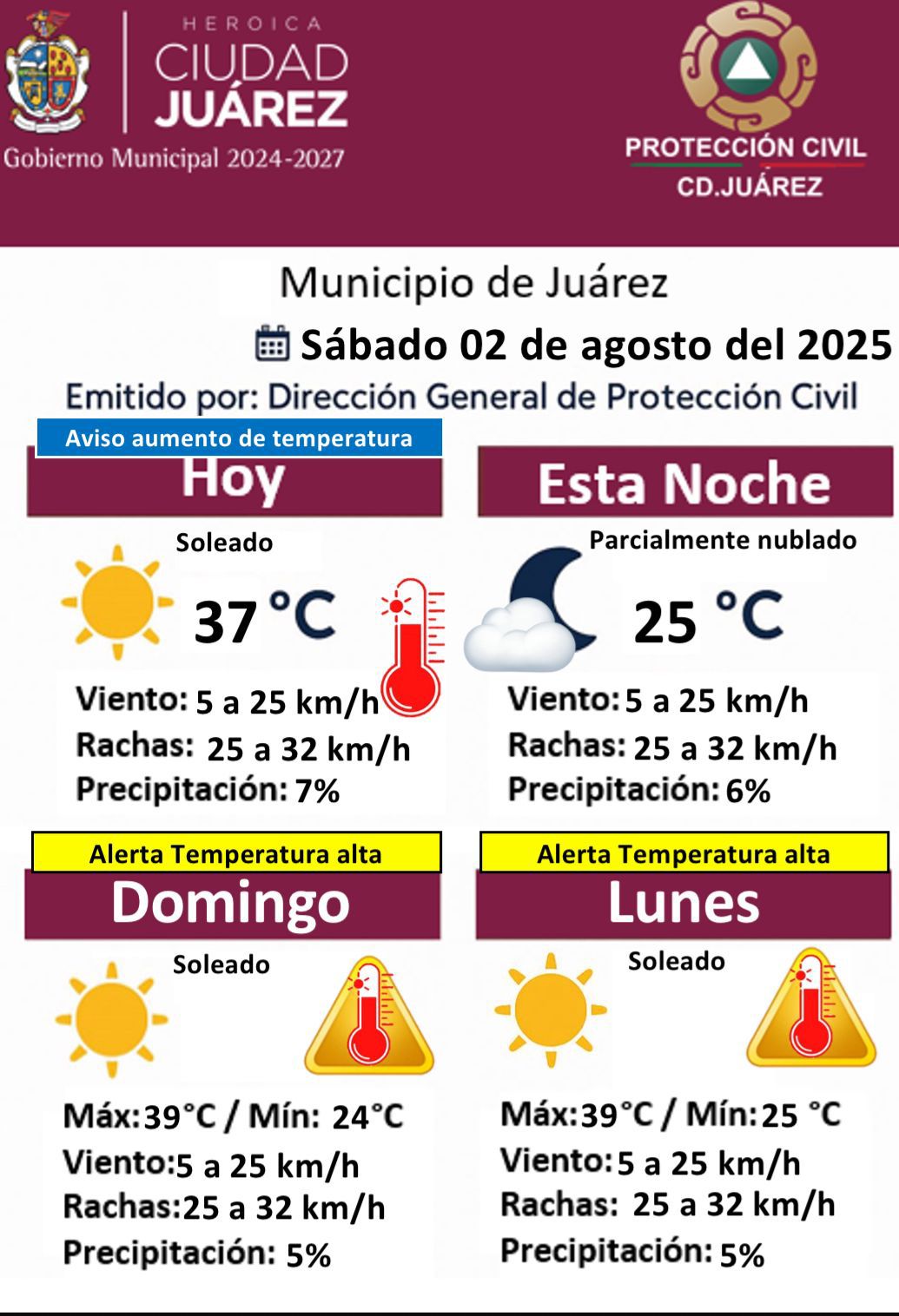 La Dirección General de Protección Civil del Municipio de Juárez emitió un aviso por aumento de temperatura para este sábado 2 de agosto de 2025. Se pronostica un día soleado con una temperatura máxima de 37 grados Celsius. El viento oscilará entre los 5 y 25 km/h, con rachas de hasta 32 km/h y una probabilidad de precipitación del 7%.