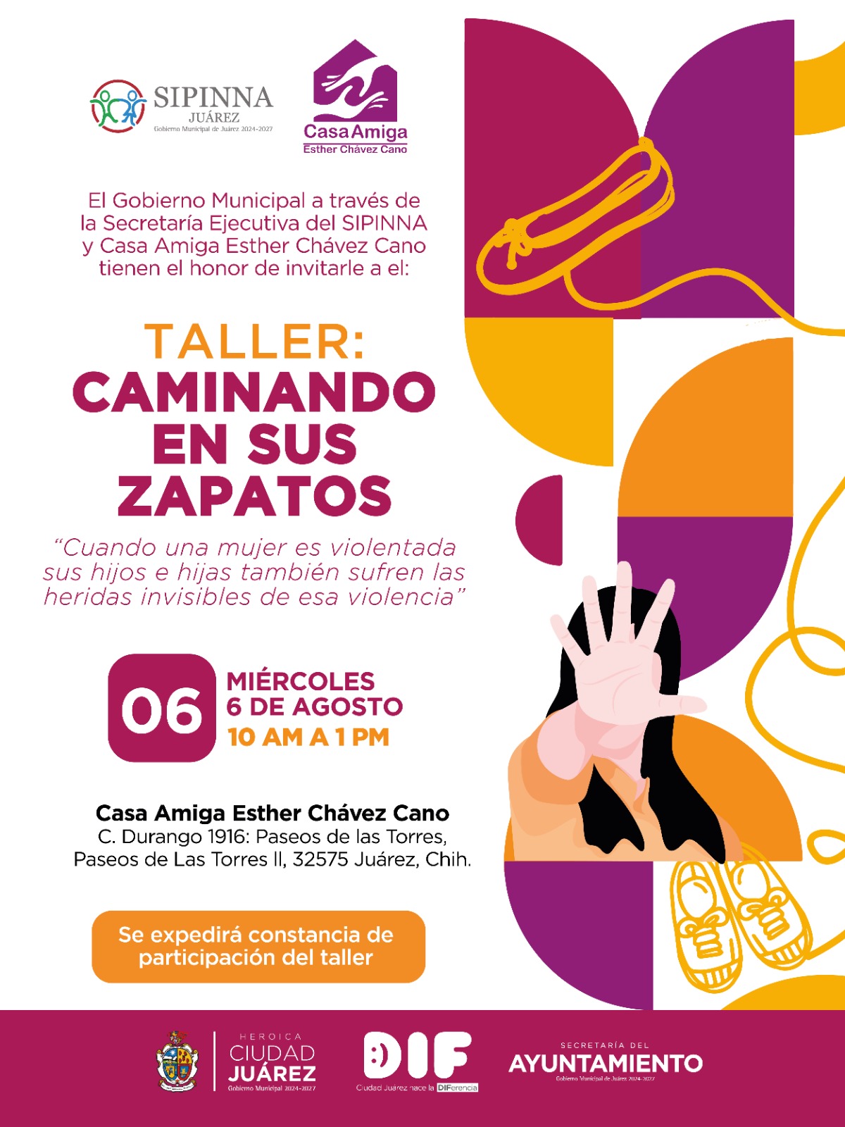 El Gobierno Municipal de Juárez, a través de la Secretaría Ejecutiva del SIPINNA y en colaboración con Casa Amiga Esther Chávez Cano, llevará a cabo el taller “Caminando en sus Zapatos”, mañana miércoles 6 de agosto de 10:00 de la mañana a la 1:00 de la tarde en las instalaciones de Casa Amiga, ubicadas en C. Durango 1916, fraccionamiento Paseos de las Torres II.