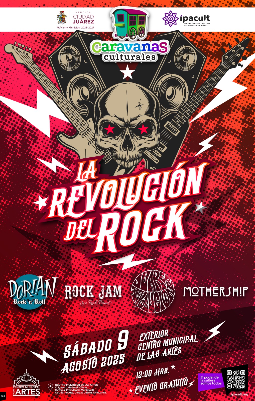 El Instituto para la Cultura del Municipio de Juárez (IPACULT) invita a la ciudadanía a disfrutar de la Caravana Cultural “La Revolución del Rock”, que se llevará a cabo este sábado 09 de agosto a partir de las 12:00 del mediodía al exterior del Centro Municipal de las Artes (CMA), en la Zona Centro.