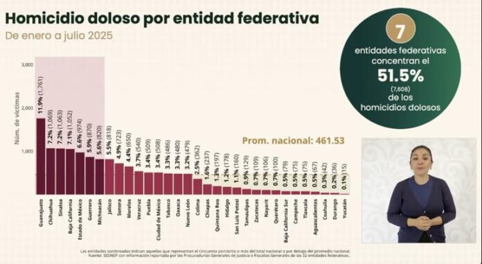 De enero a julio, siete estados concentraron el 51.5% de los homicidios: Guanajuato (11.9%), Chihuahua (7.2%), Sinaloa (7.2%), Baja California (7.1%), Estado de México (6.6%), Guerrero (5.9%) y Michoacán (5.6%).