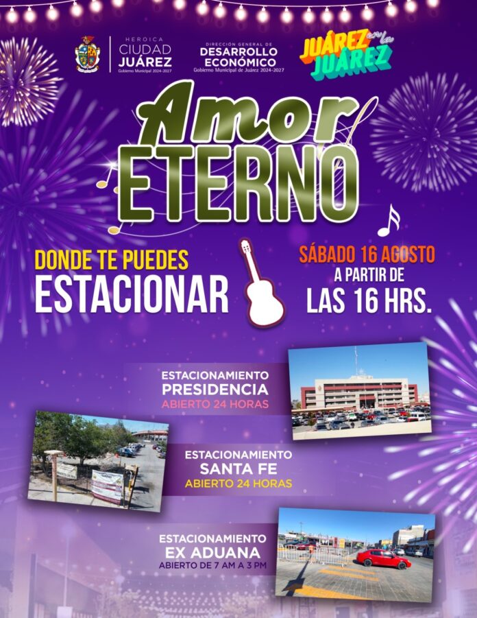 La Operadora Municipal de Estacionamientos de Juárez (OMEJ) informó que, con motivo del evento “Juárez en la Juárez, Amor Eterno”, que se llevará a cabo el próximo sábado 16 de agosto a partir de las 4:00 de la tarde, se pondrán a disposición de la ciudadanía espacios seguros y vigilados para el resguardo de vehículos.