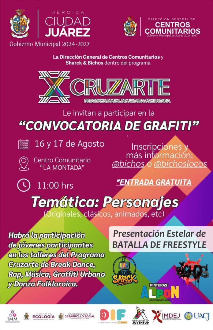 La Dirección de Centros Comunitarios, en coordinación con Bichos Colectivo y como parte del programa Cruzarte, invitan a la ciudadanía a participar en el concurso de grafiti.